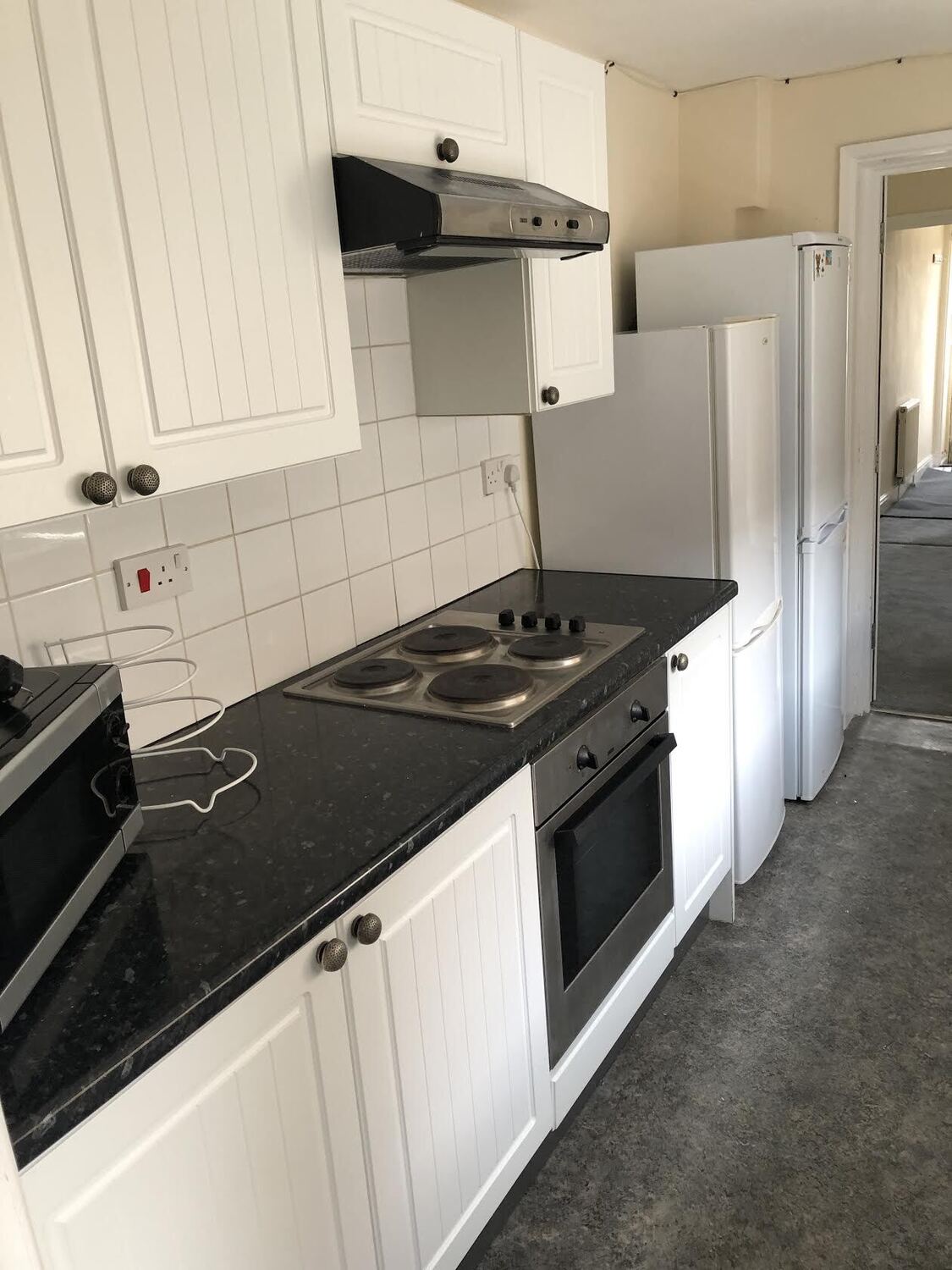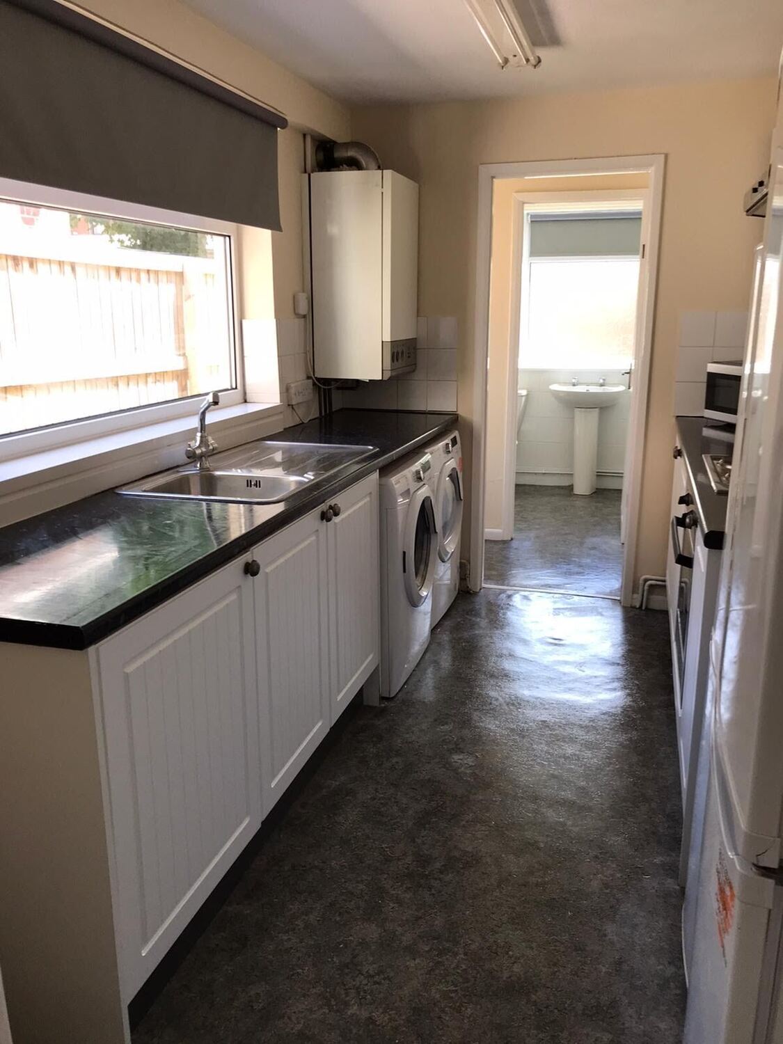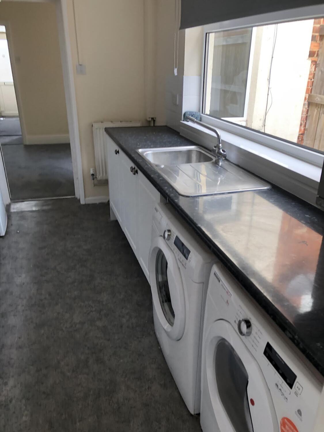 Kitchen comprises of a good range of base and wall units, sink unit, two fridge freezers, built in oven, hob and extractor fan, microwave, washing machine and tumble dryer and door leading to small hallway with door to bathroom and rear door leading out into the garden.