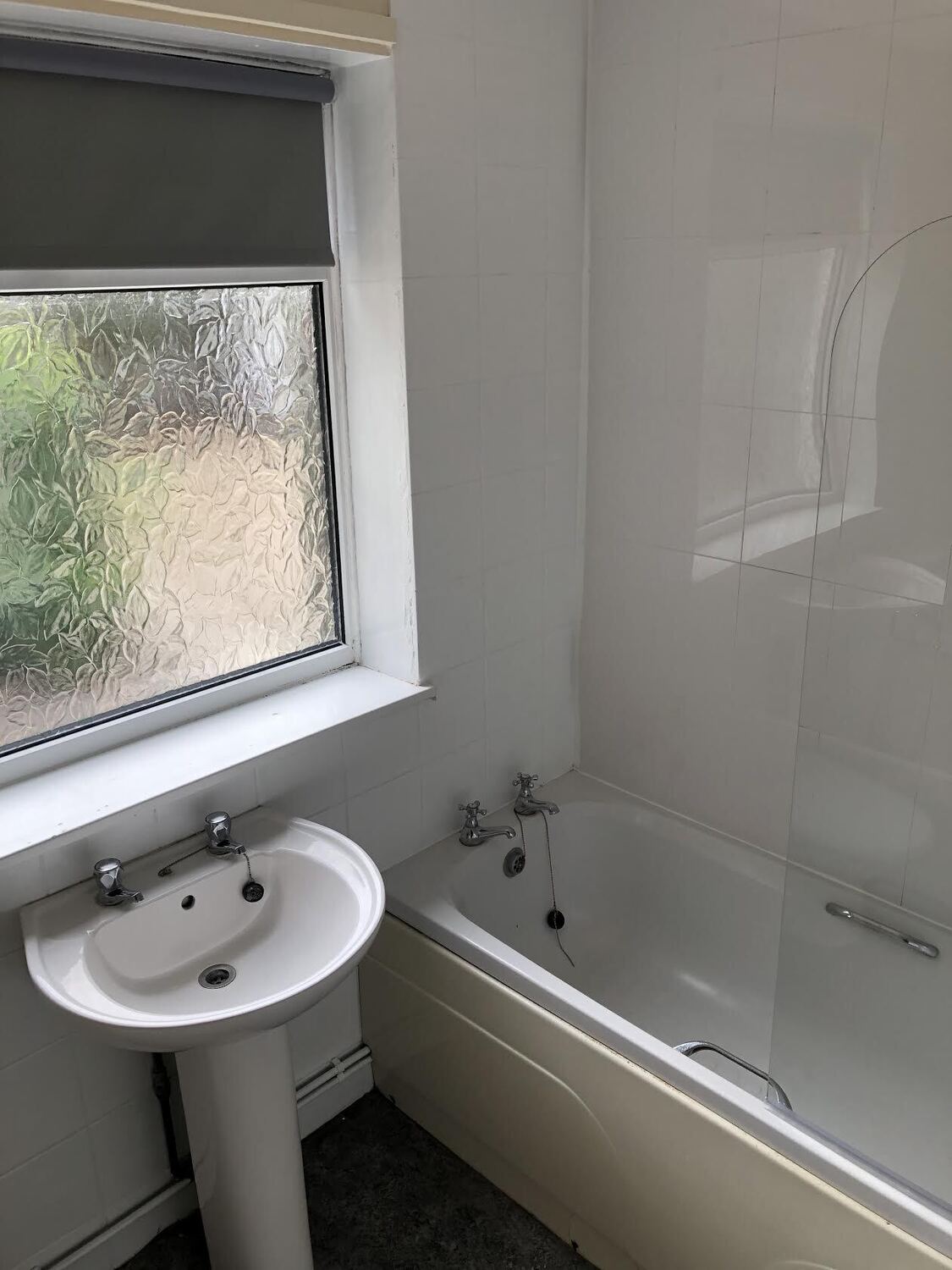 Bathroom consisting of toilet, pedestal sink and bath with glass screen and shower over bath, tiled and recently decorated.